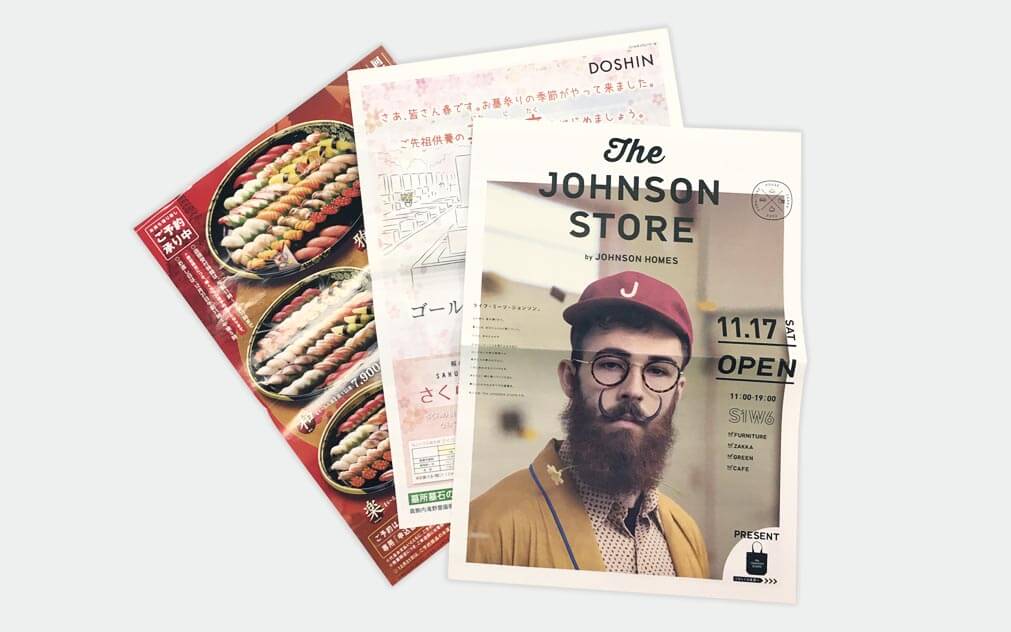 広く大多数の人々へ情報を届けるチラシ。当社では輪転機を2台保有しているため、大量・スピーディ・高品質な印刷が可能です。